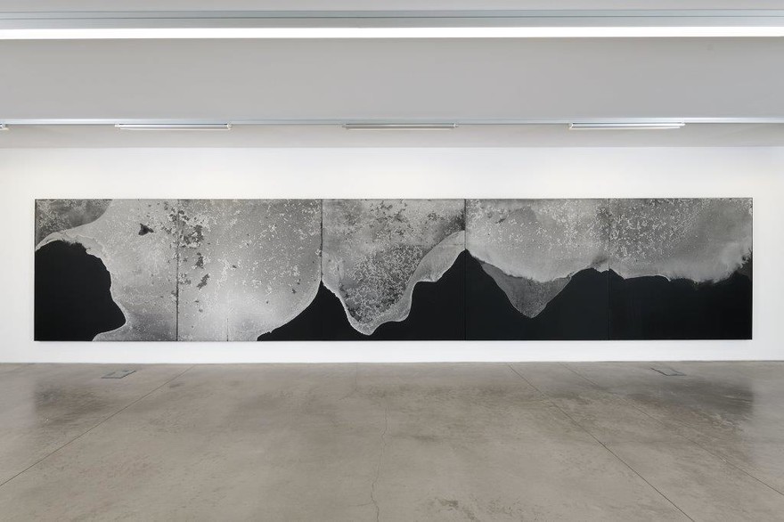 Légende de l’image : Capucine Vandebrouck, NaCI, 2015. Bois, peinture et sel cristallisé, 5 panneaux. Courtesy de l’artiste. Photographie Aurélien Mole